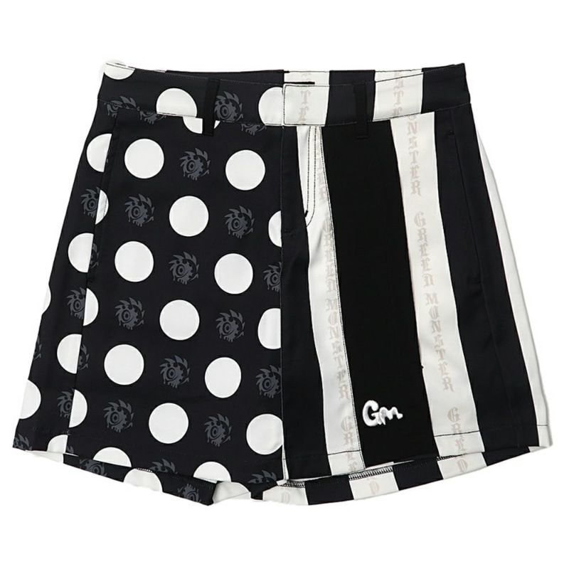 レトロなストライプパターンとドットパターンをミックスしたデザインのスカートパンツ。